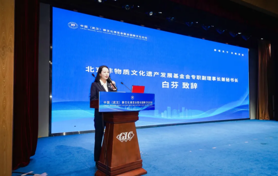 北京非物质文化遗产发展基金会专职副理事长兼秘书长 白芬 发表致辞,介绍了基金会推动非遗保护与国际交流的成果,重点提及“中马非遗艺术珍品展”的成功举办与归国首展,呼吁通过空间营造、文创开发、研学与数字化等方式推动非遗与静文化深度融合。