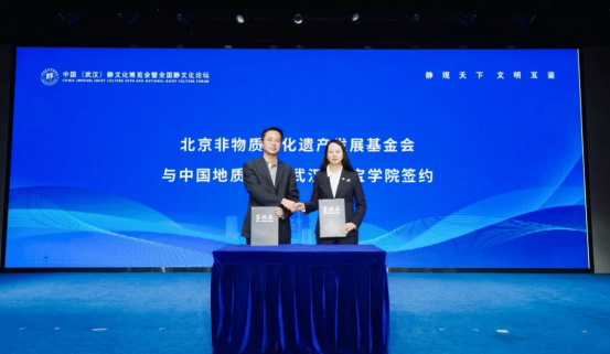 开幕式上,两项重磅战略签约与重要成果发布成为亮点,标志着非遗传承迈入“校地联动、产融协同” 的体系化发展新阶段。北京非物质文化遗产发展基金会与中国地质大学(武汉)珠宝学院签署 “非遗进校园” 合作协议,此项合作将系统构建非遗传承的育才体系,让文化基因在青年心中生根发芽,为民族未来注入深沉力量。